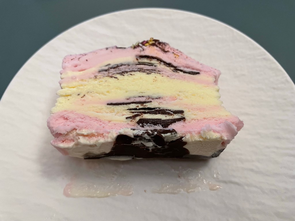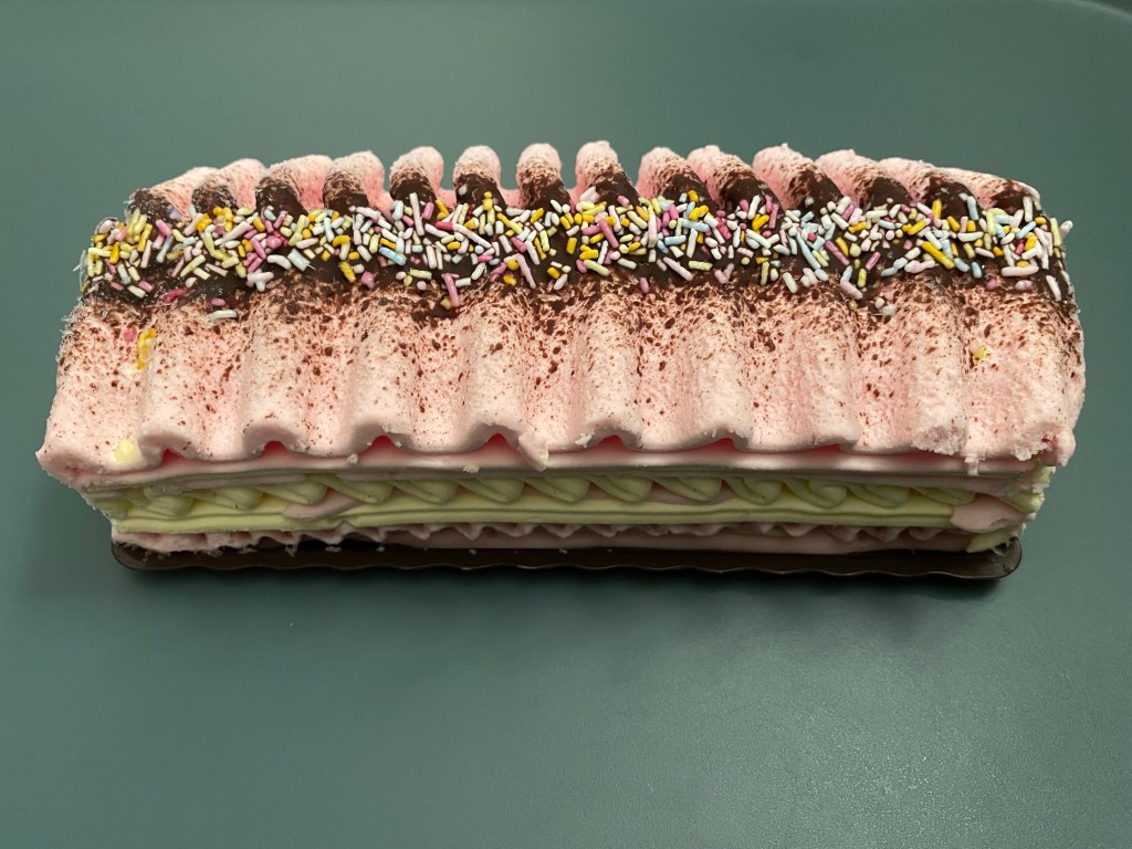 Description: Vanilla ice cream and strawberry flavour ice cream between crisp chocolate flavour layers topped with multi-coloured sugar strands
