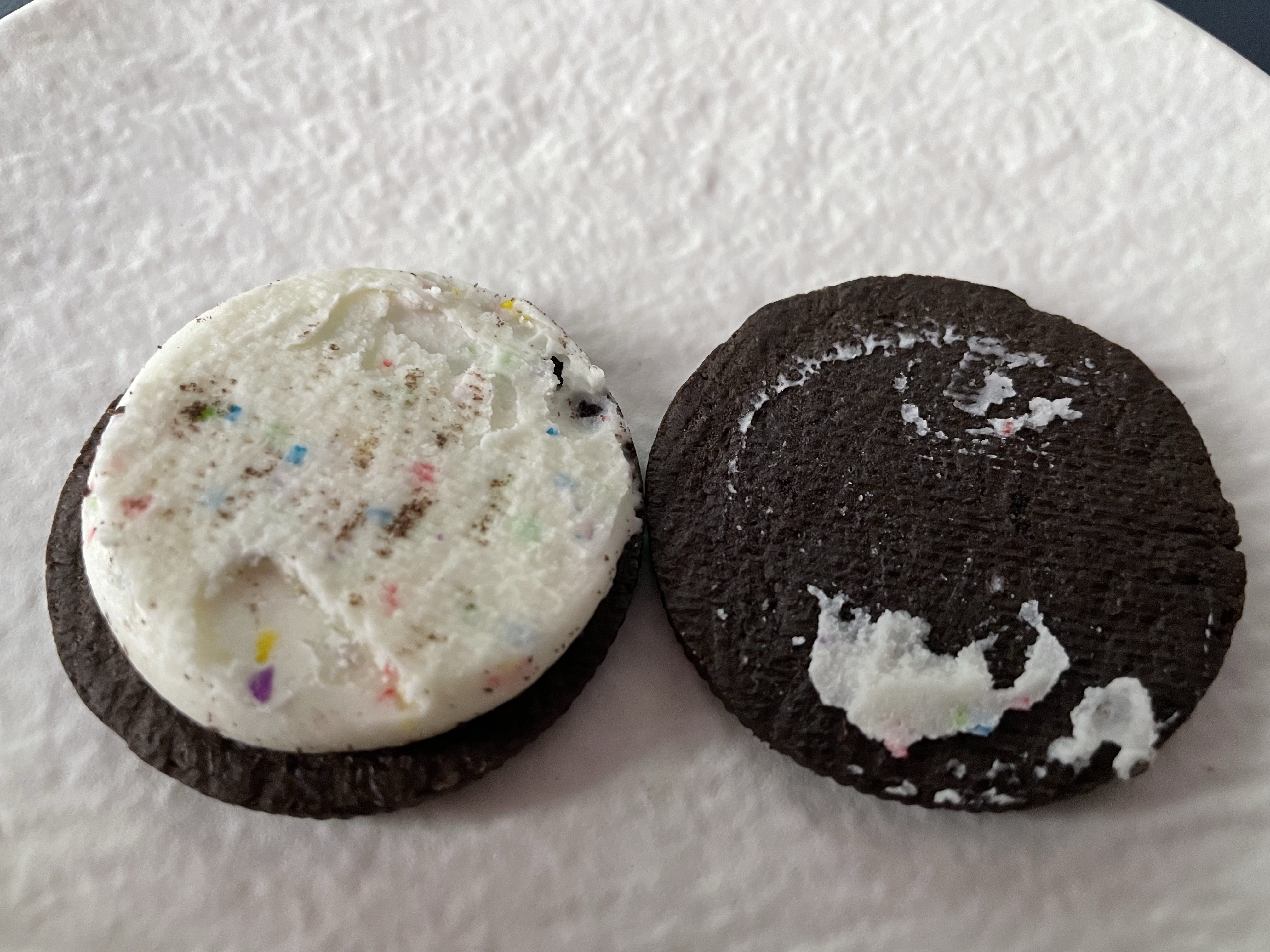 It’s worth noting the thickness of the cream too. This is pretty much the same as UK “Double Creme” Oreos. This is part of the reason that US Oreos are better than the UK ones anyway – the UK ones have such pitiful amounts of cream in the middle. You can see some good colourful sprinkles inside, although they have no real discernable texture of their own.
